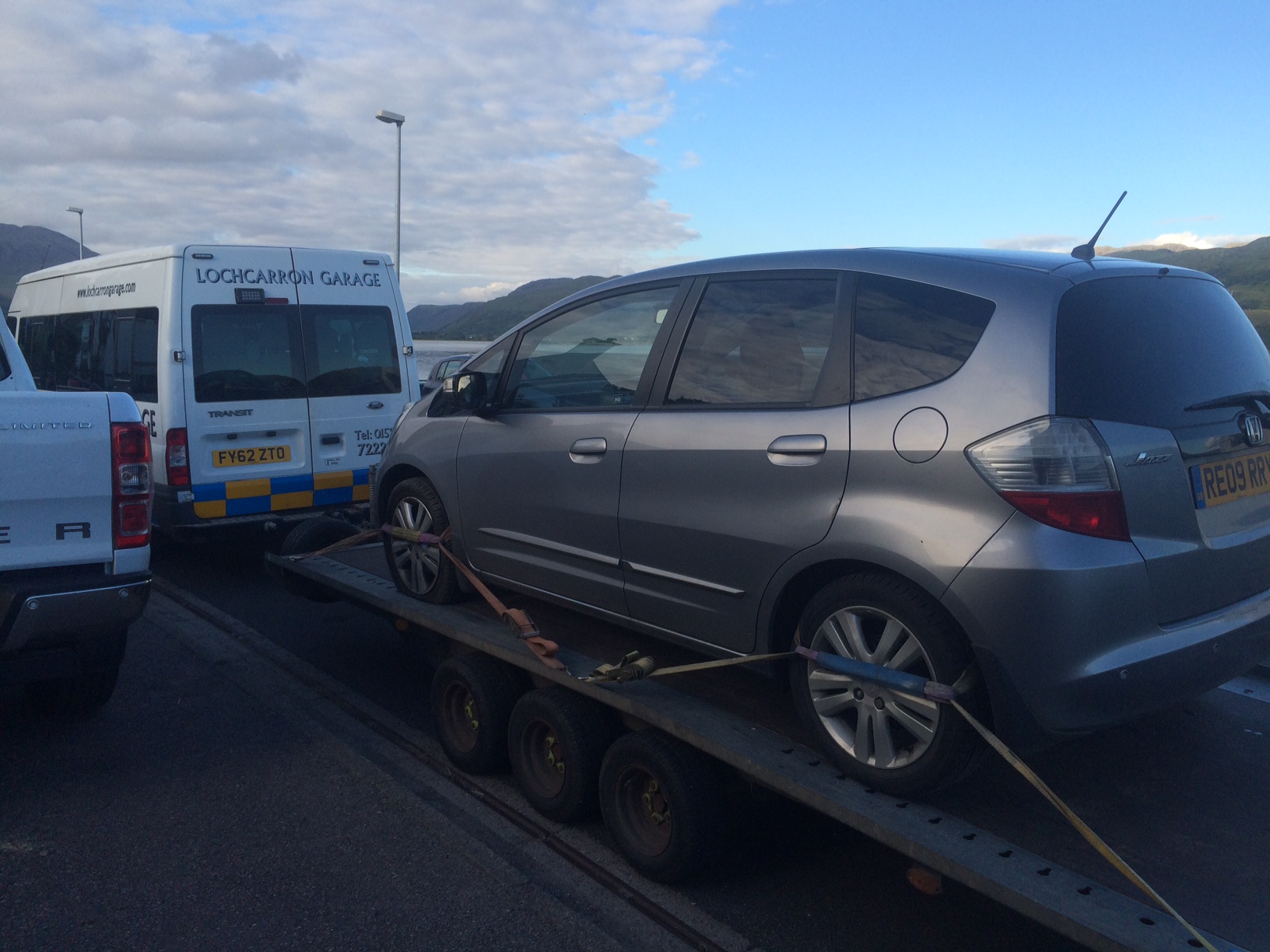 Our poor little Honda being towed 🙁
