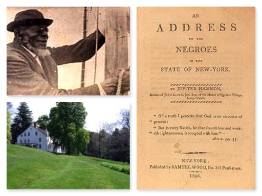 (Top left) Jupiter Hammon was pro slavery. (bottom left) Home to Jupiter Hammon, the second known published American author of African descent. (Right) Hammon’s Address to the Negroes in New York State, 1806 (image from http://rollingout.com/2014/02/11/black-history-month-profile-jupiter-hammon-slave-slavery/